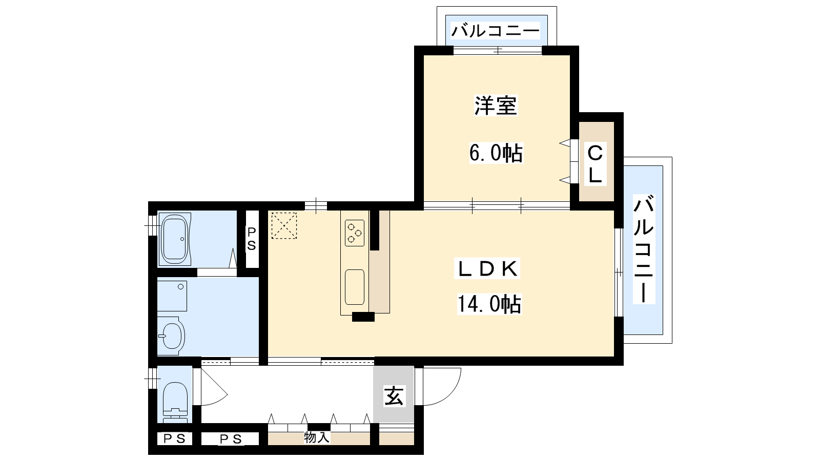 - 洋室6帖、LDK14帖