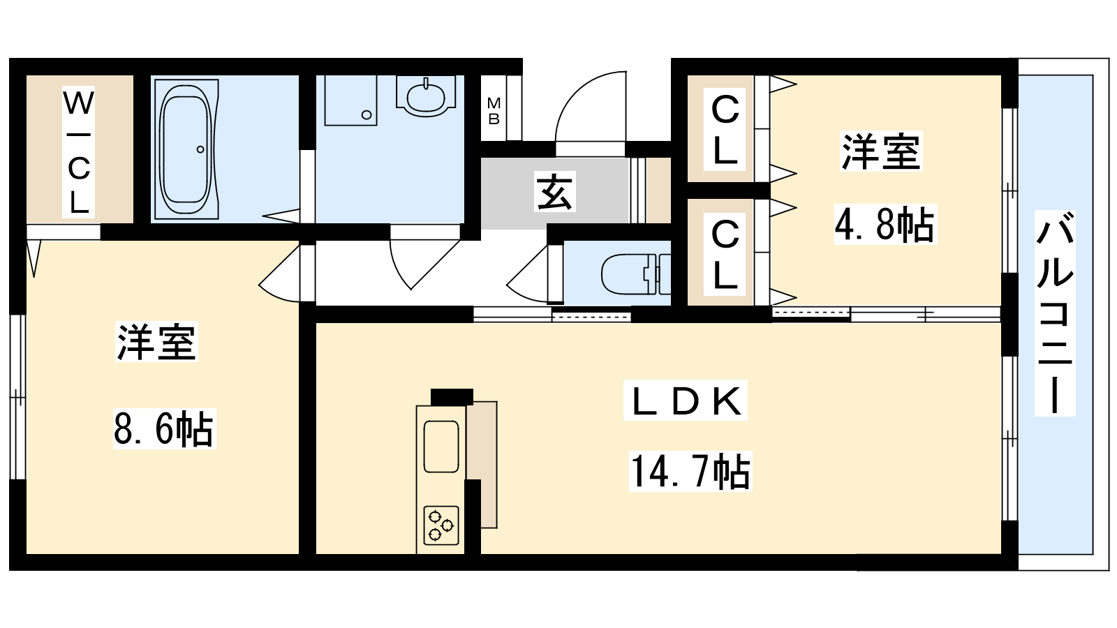 - LDK14.7帖、洋室8.6帖、洋室4.8帖