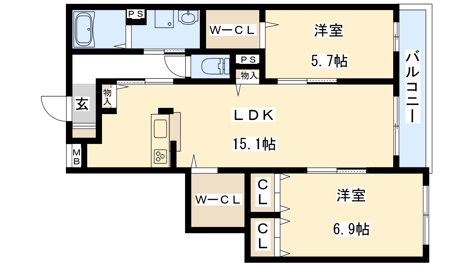 - LDK15.1帖、洋室6.9帖、洋室5.7帖