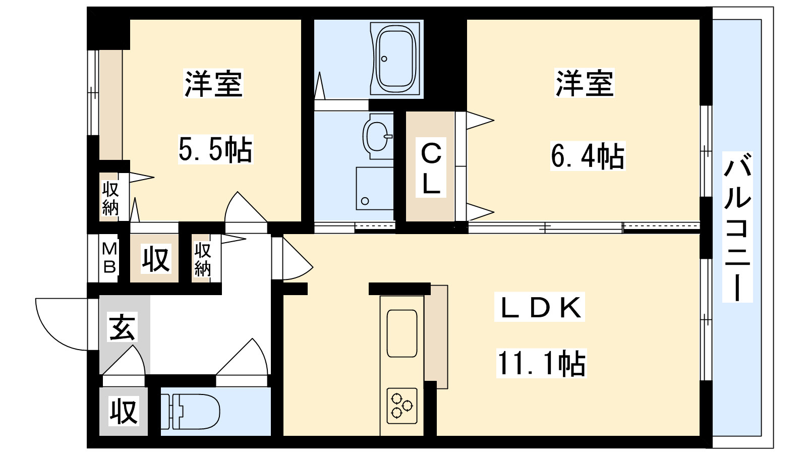 - LDK11.1帖、洋室6.4帖、洋室5.5帖