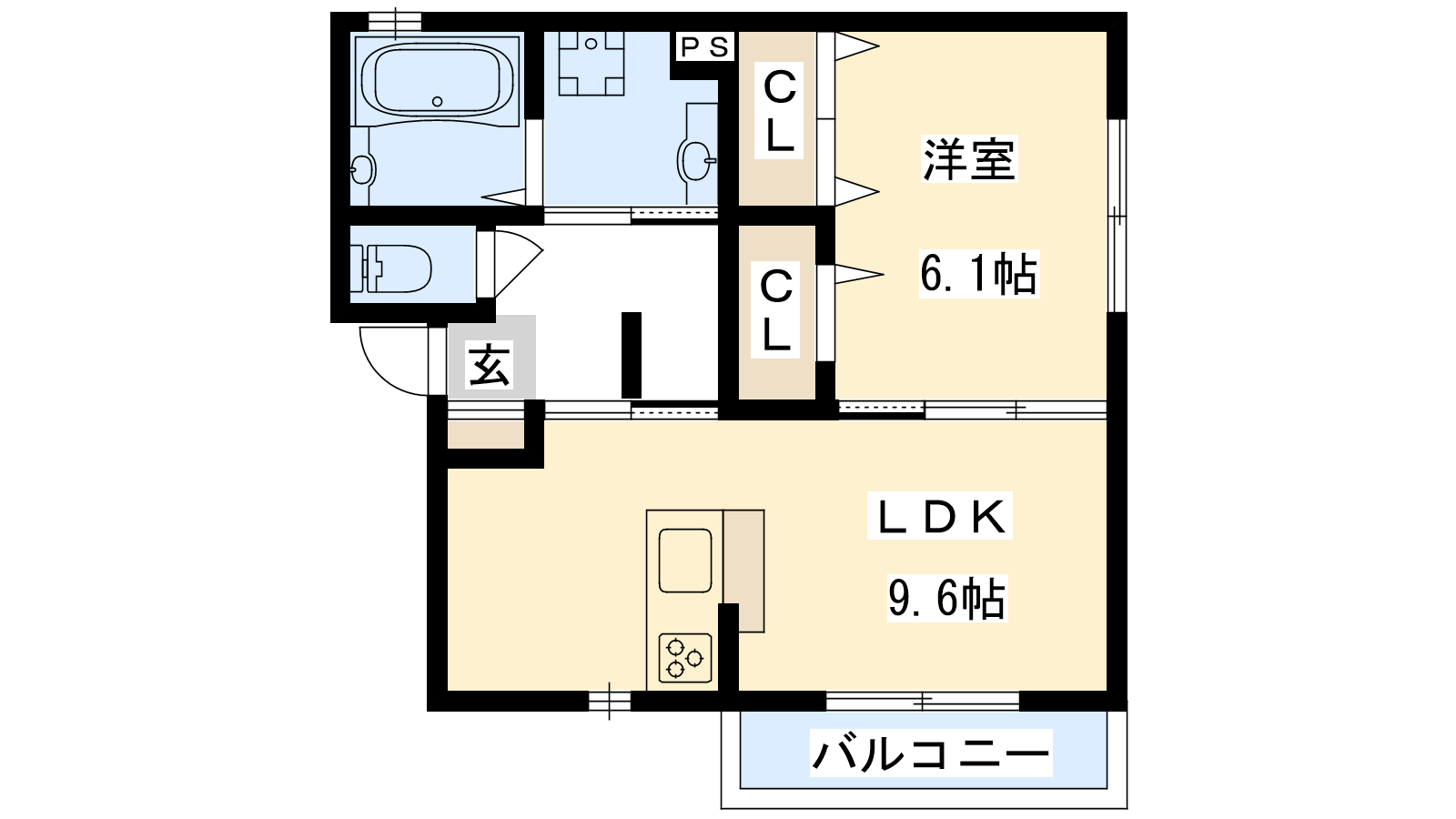 - LDK9.6帖、洋室6.1帖