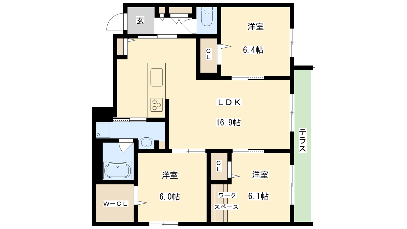 - LDK16.9帖、洋室6.4帖、洋室6.1帖、洋室6帖
