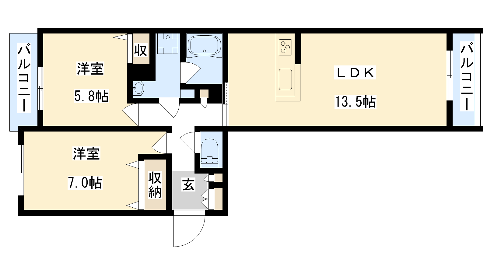 - LDK13.8帖、洋室7帖、洋室5.7帖