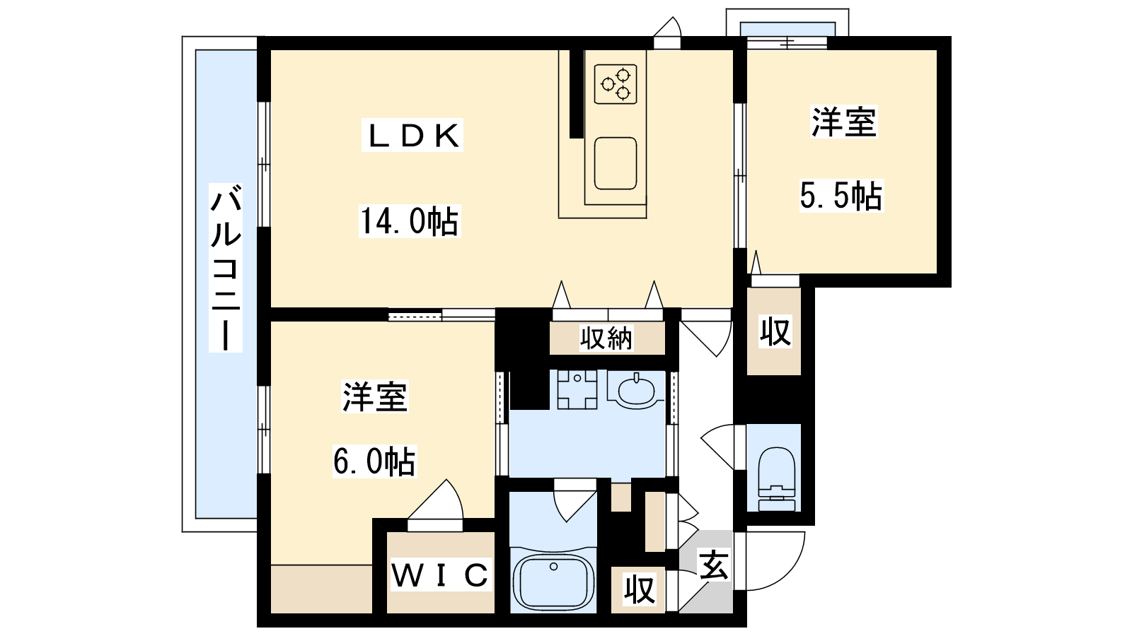 - LDK14帖、洋室6帖、洋室5.5帖