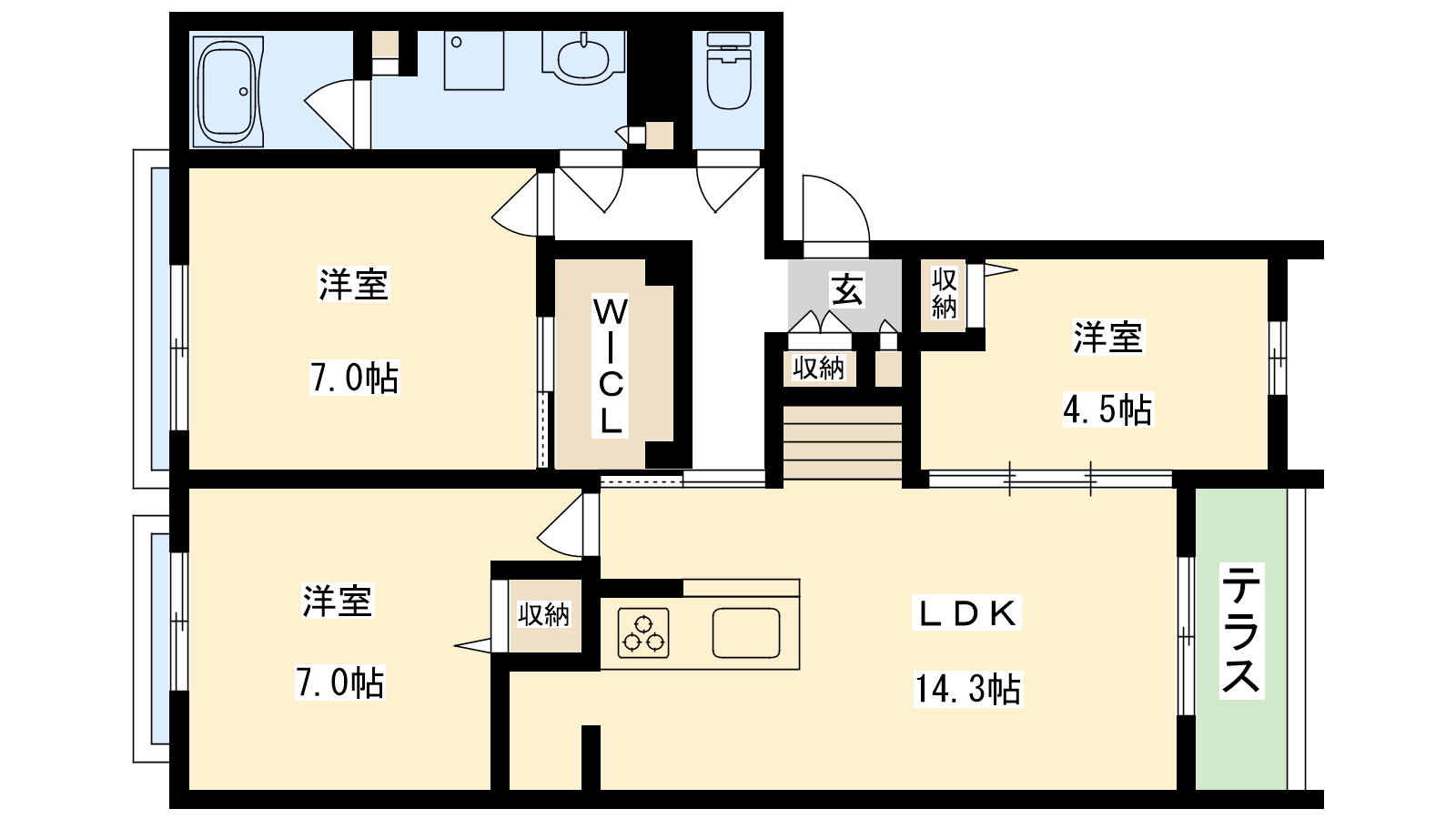 - LDK14.3帖、洋室7帖、洋室7帖、洋室4.5帖