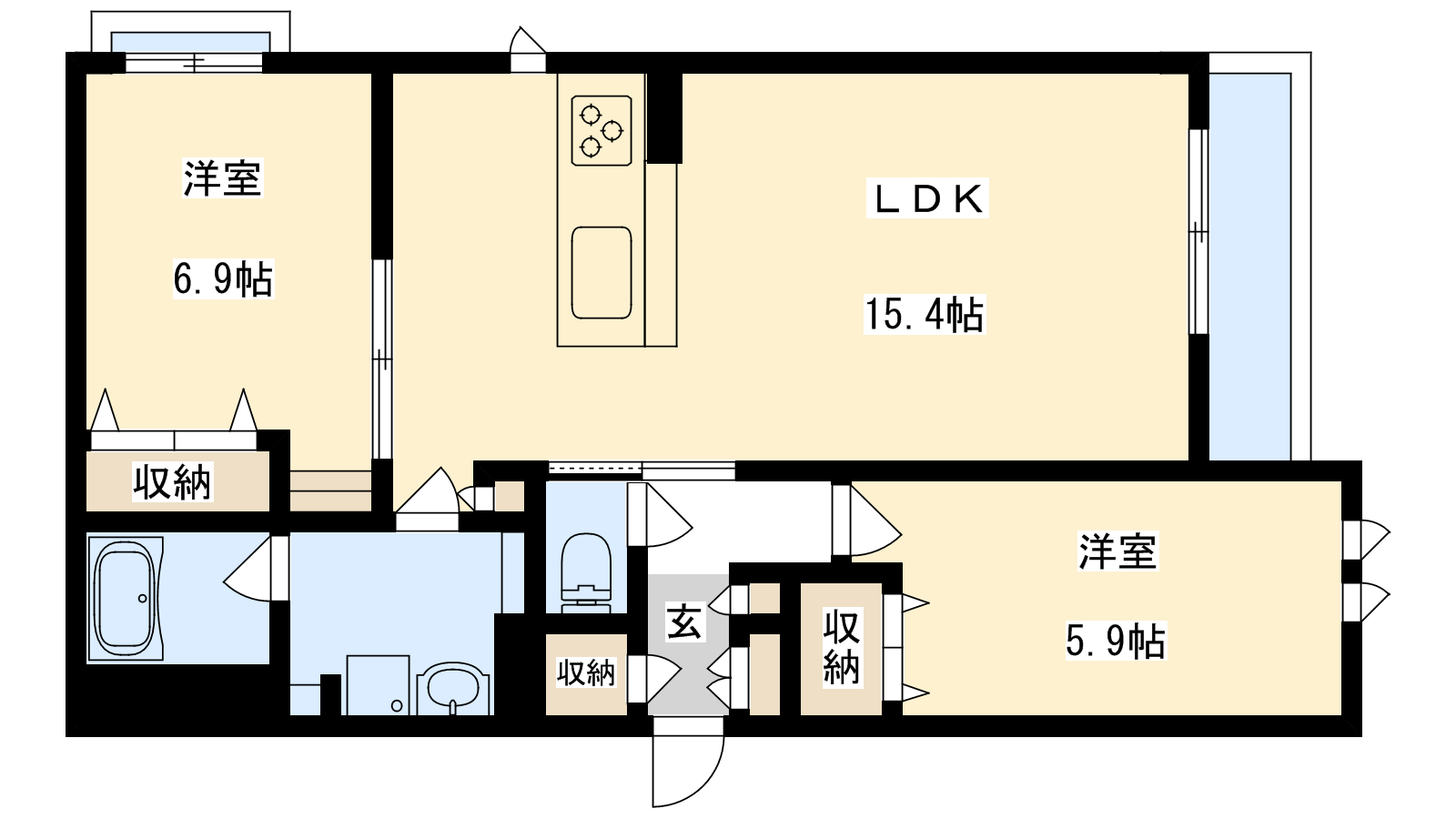 - LDK15.4帖、洋室6.9帖、洋室5.9帖
