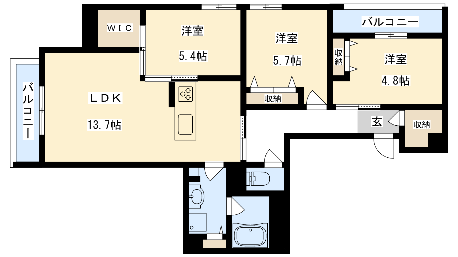 - LDK13.7帖、洋室5.7帖、洋室5.4帖、洋室4.8帖