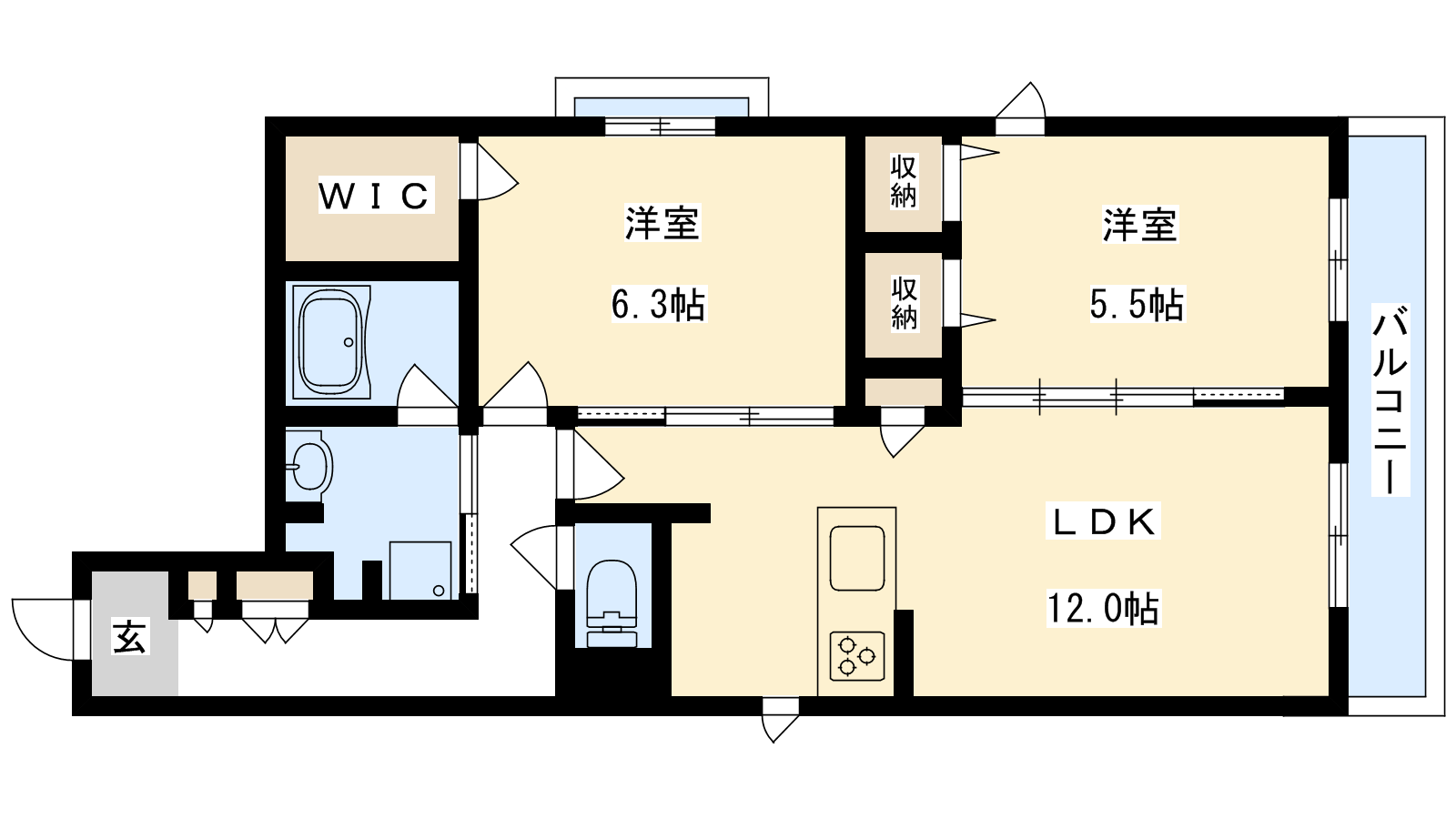 - LDK12帖、洋室6.3帖、洋室5.5帖