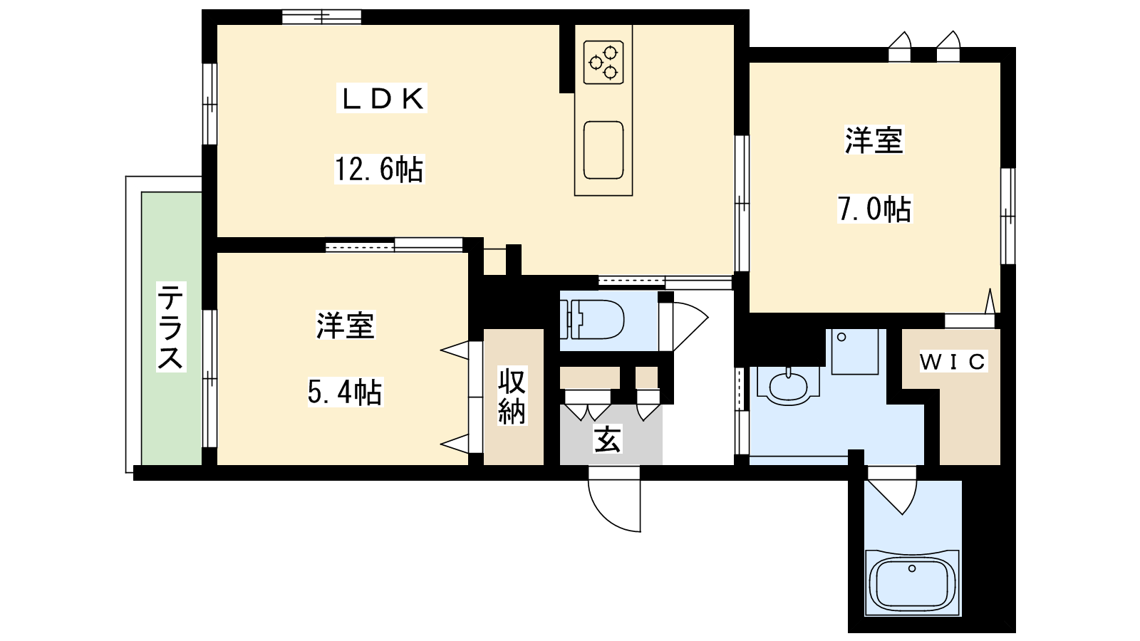 - LDK12.6帖、洋室7帖、洋室5.4帖