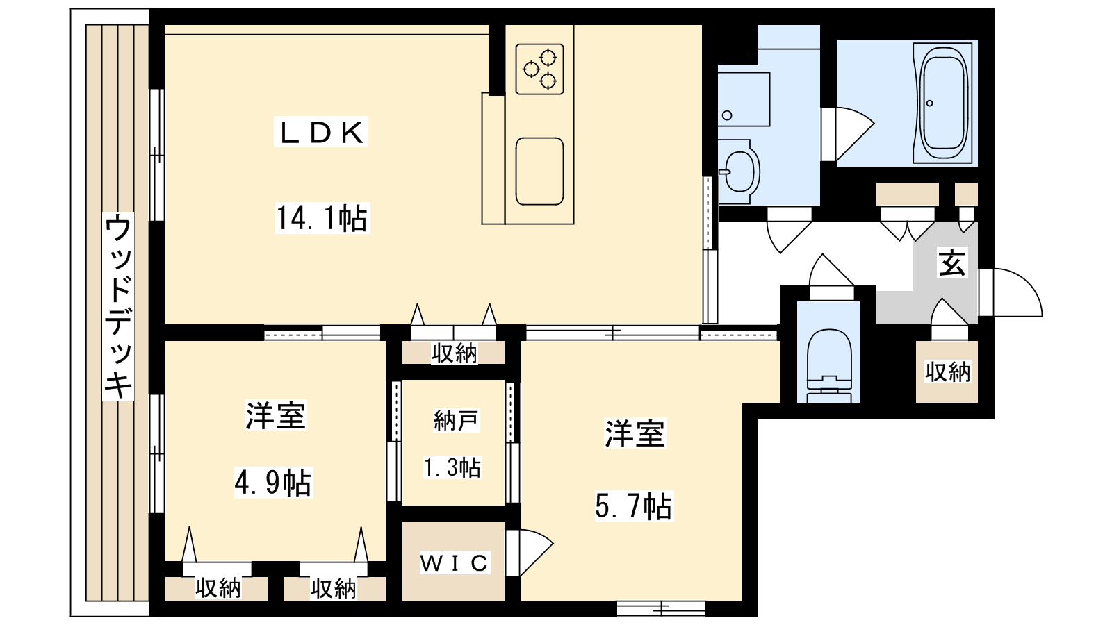 - LDK14.1帖、洋室5.7帖、洋室4.9帖、S1.3帖