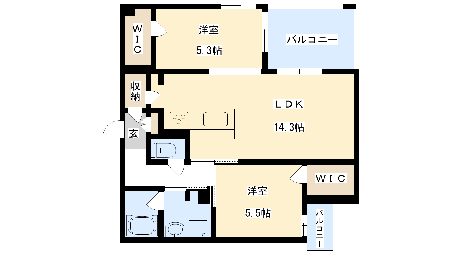 - LDK14.3帖、洋室5.5帖、洋室5.3帖