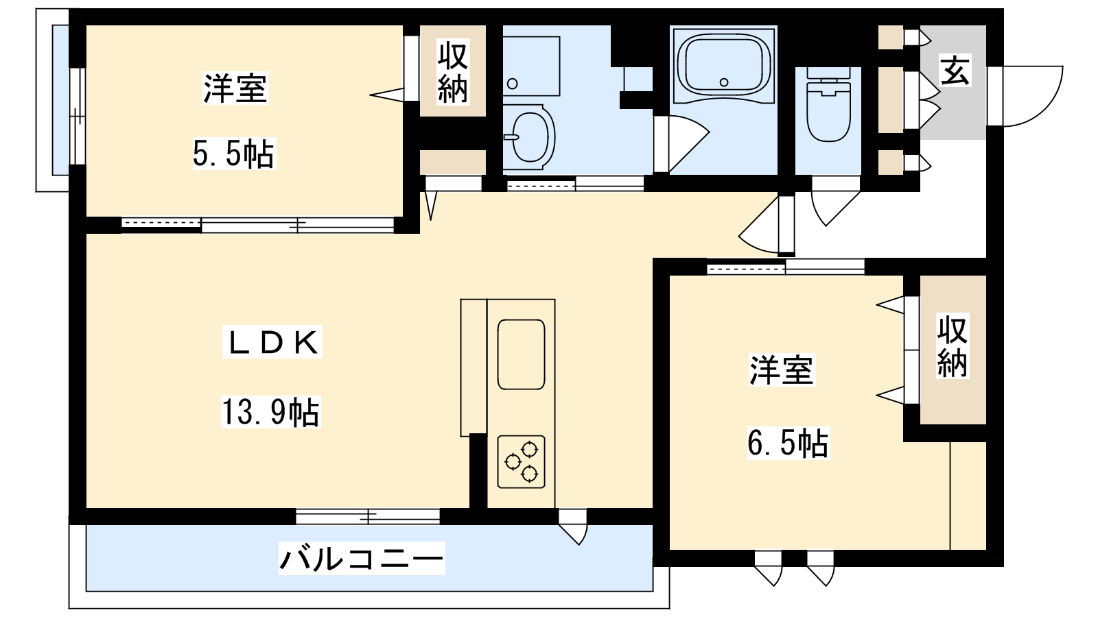 - LDK13.9帖、洋室6.5帖、洋室5.5帖