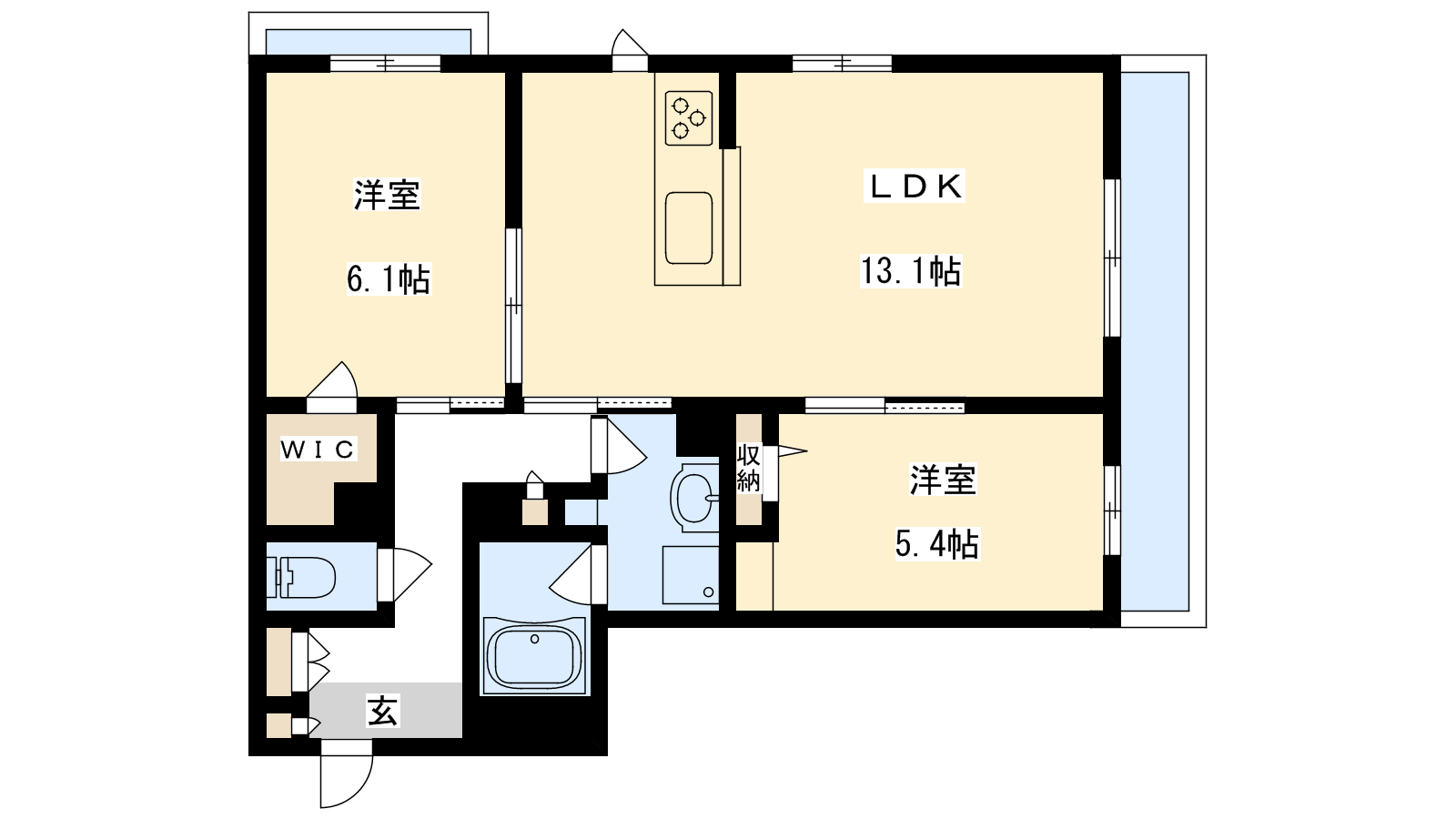 - LDK13.1帖、洋室6.1帖、洋室5.4帖