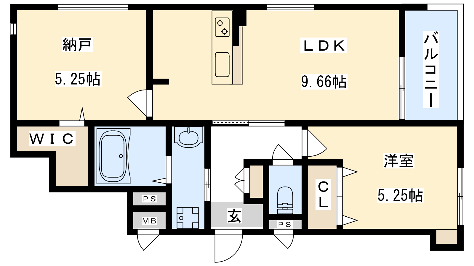 - LDK9.66帖、洋室5.25帖、S5.25帖